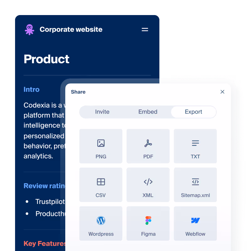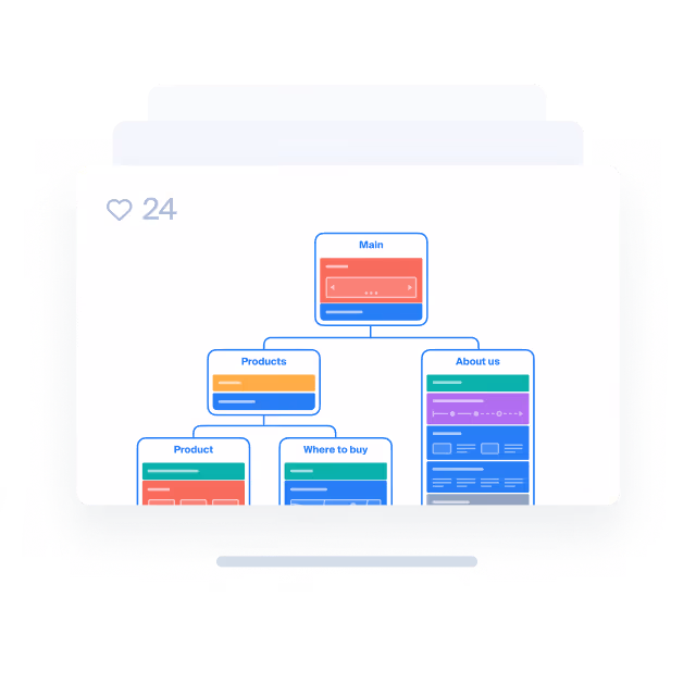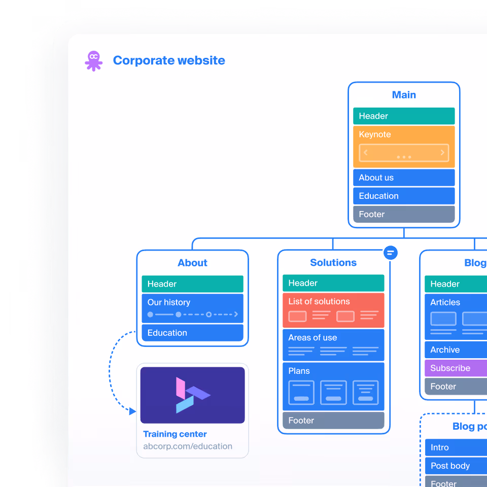 Explore website page structure in a visual and clear appearance. Identify improvement areas and add new pages or blocks, make changes to other, generate content.