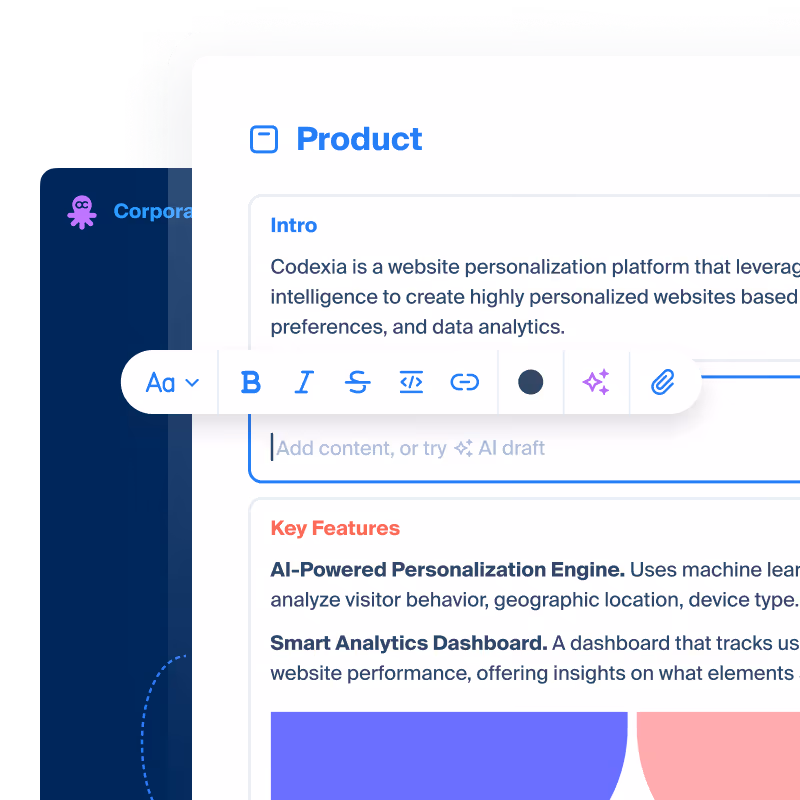 Individually or together with your team, generate content manually or with the help of AI. Explore our fancy editor to create beautifully formatted texts for your website.