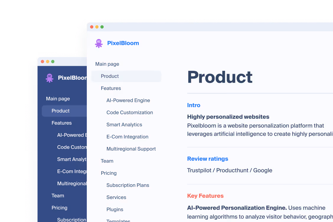 Describe your website in a few words to generate a complete visual sitemap with page hierarchy, content blocks, and SEO tags.